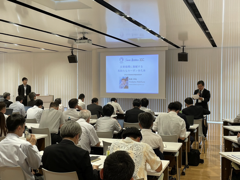 三件目は,東北大学の西原洋知先生より,3DC社のグラフェンメソスポンジについての詳細なご説明と市場展開の取り組みについてご講演をいただきました。これまで困難であった,欠損が少なく高比表面積を有するグラフェンの市場投入を目指されているとのことでした。これまでの炭素材料とは一線を画する材料の開発に成功したことが起業化への重要なモチベーションであったことをお伺いし,材料開発の重要性を感じたご講演でした。