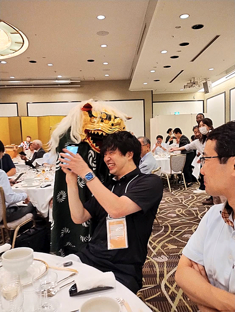 また,Banquetでは多数の海外の研究者と交流を深めることができました。余興として,獅子舞が登場し参加者の頭を咥えるパフォーマンスを披露いただきました。私もしっかりと頭を咥えられておきました(図2)。餅つきの体験もあり,特に海外からの参加者の皆様は興味深そうにカメラを構えて様子を撮影していました。